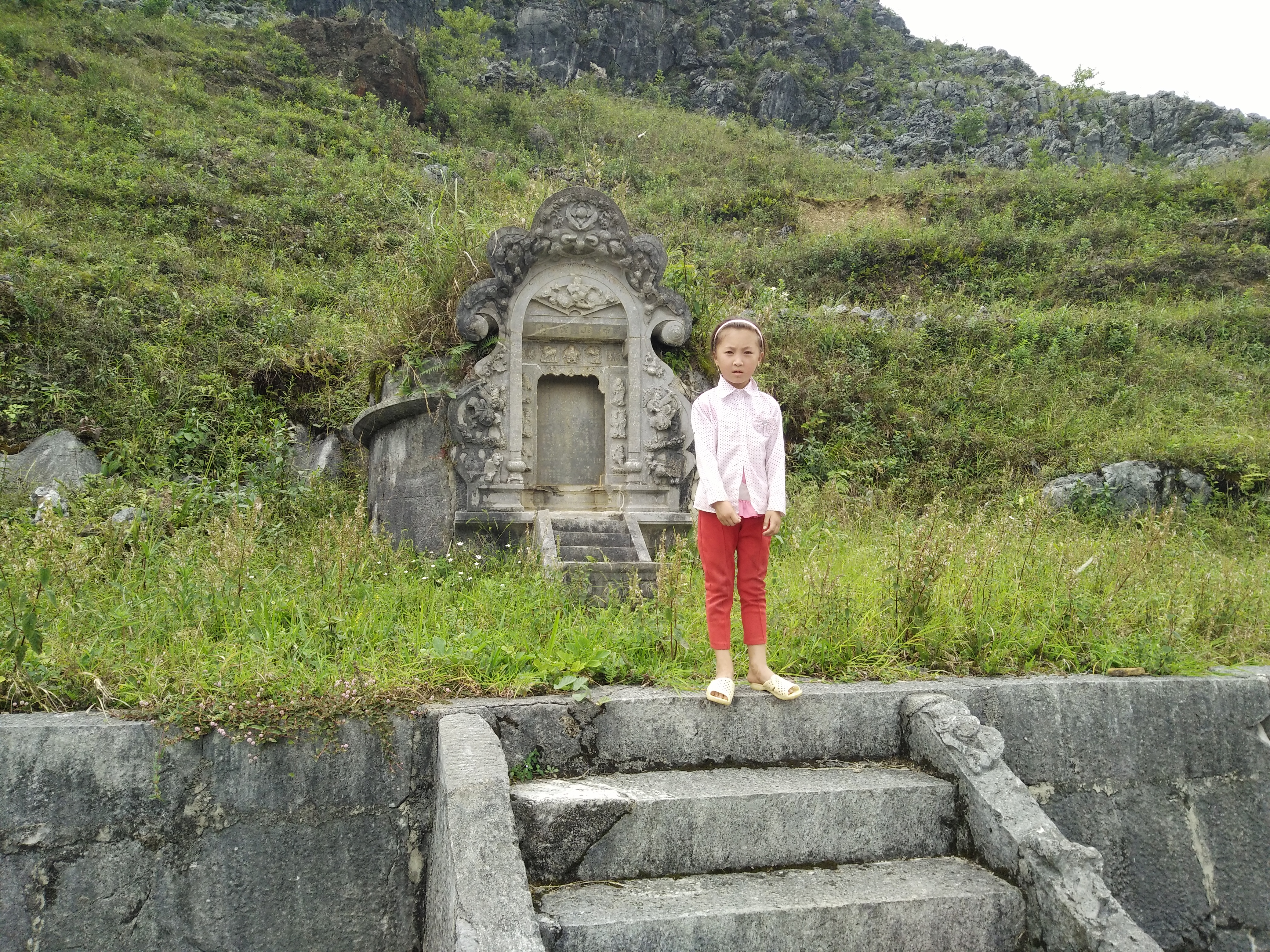 Trước cửa mộ là cầu thang 3 bậc đi xuống sân lớn; Nền sân và các bậc thang được xếp bằng các khối đá lớn do thợ đục đá tạo ra, mặt sân vuông với diện tích 40 m2 , Hai bên trước sân là 2 cột trụ hình vuông bằng đá cao 10 mét, trên đầu cột trụ là hình đầu sư tử được đạt lên thể hiện uy nhiêm và linh thiên.